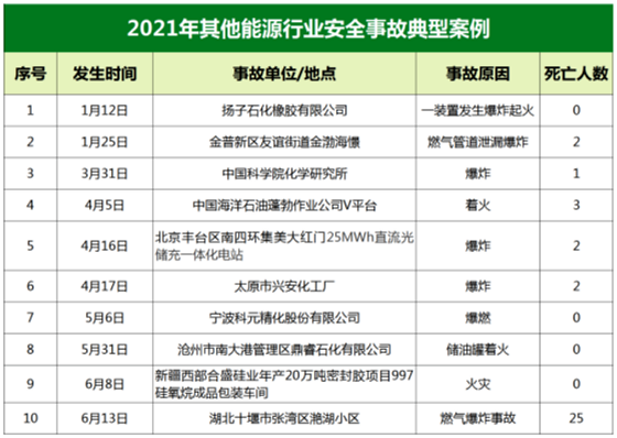 據(jù)國際能源網(wǎng)記者總結(jié):2021年上半年典型能源安全事故中,其他能源行業(yè)安全事故多為火災(zāi)事故。天然氣、化工廠、儲(chǔ)能電站是火災(zāi)事故隱患較為集中的領(lǐng)域,這些領(lǐng)域中防火、防爆是預(yù)防事故發(fā)生的重點(diǎn)工作。