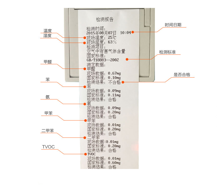 ▲現(xiàn)場測定甲醛含量,并可打印出甲醛、苯、氨、甲苯、二甲苯、TVOC、溫度、濕度、八項檢測結果。