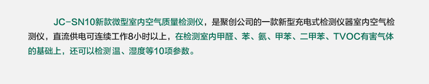 JC-SN10新款微型室內空氣質量檢測儀,是聚創(chuàng)公司的一款新型室內空氣檢測儀,是目前國內較少的一款充電式檢測儀器,其內置大容量鎳氫電池,交、直流兩用供電方式,直流供電可連續(xù)工作8小時以上,在檢測室內甲醛、苯、氨、甲苯、二甲苯、TVOC有害氣體的基礎上,還可以檢測溫、濕度等10項參數,是目前國內較少的一款十合一產品。